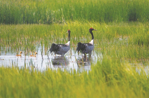这些年,青海湖生态环境持续向好,湿地面积累计增加1.35万公顷,高密度植被覆盖累计增大21.33公顷,沙地、裸地、盐碱化土地面积累计减少3960公顷。青海湖为黑颈鹤繁衍生息打造了舒适的“温床”。