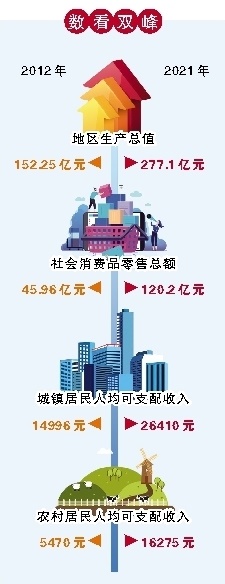 全县地区生产总值从2012年的152.25亿元增加到2021年的277.1亿元;人均地区生产总值40537元,是2012年的2.28倍,年均增长9.6%;