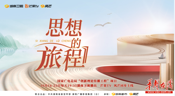 《思想的旅程》由中共湖南省委宣传部和湖南广播影视集团(台)联合出品,湖南都市频道、风芒承制。作为湖南广电迎接党的二十大“奋进新时代洪波曲”理论、新闻精品三重奏的收官之作,《思想的旅程》将于10月16日至23日在湖南卫视每天19:35播出,芒果TV和风芒APP等网络平台同步上线。