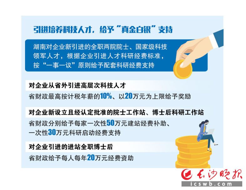 创新是第一动力,人才是第一资源。为了支持鼓励企业引进培养科技人才,湖南对企业新引进的全职两院院士、国家级科技领军人才,根据企业引进人才科研经费标准,按“一事一议”原则给予配套科研经费支持;对企业从省外引进高层次科技人才,省财政最高按计税年薪的10%、以20万元为上限给予奖励。对企业新设立且经认定批准的院士工作站、博士后科研工作站,省财政分别给予每家一次性50万元建站经费补助、一次性30万元科研启动经费支持。对企业引进的进站全职博士后,省财政给予每人每年20万元经费资助。省科技创新人才计划向科技型企业和科研一线科技人才倾斜,对企业申报且获得立项的省科技创新创业领军人才项目,每项最高资助200万元。