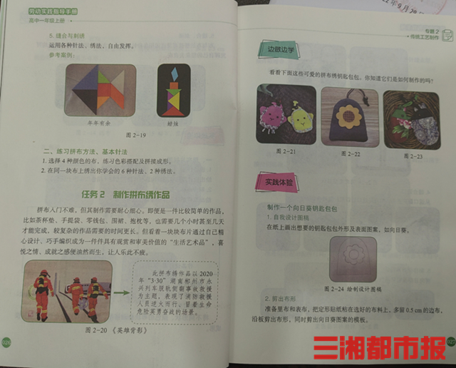 华声在线10月9日讯(全媒体记者 张洋银 通讯员 张雯毅)“咦,我们的课本有消防员叔叔背影呢,还是布绣,真好看。”开学不久后,不少学生发现湖南省劳动教育实践高中一年级上册专题2传统工艺制作的教材内出现消防员身影。它的创作人是郴州市永兴县大布江拼布传承人、消防宣传志愿者何娟。
