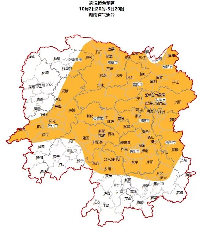 华声在线10月2日讯(全媒体记者 肖秀芬 通讯员 张婷婷)热浪滚滚,高温不减。今日16时,省气象台继续发布高温橙色预警:预计2日20时至3日20时,长沙、株洲、湘潭、衡阳、邵阳东部、岳阳、常德、张家界东部、益阳、郴州北部、永州北部、怀化中北部、娄底将达到37℃以上高温,局部地区将达39℃以上,请做好相应防范工作。
