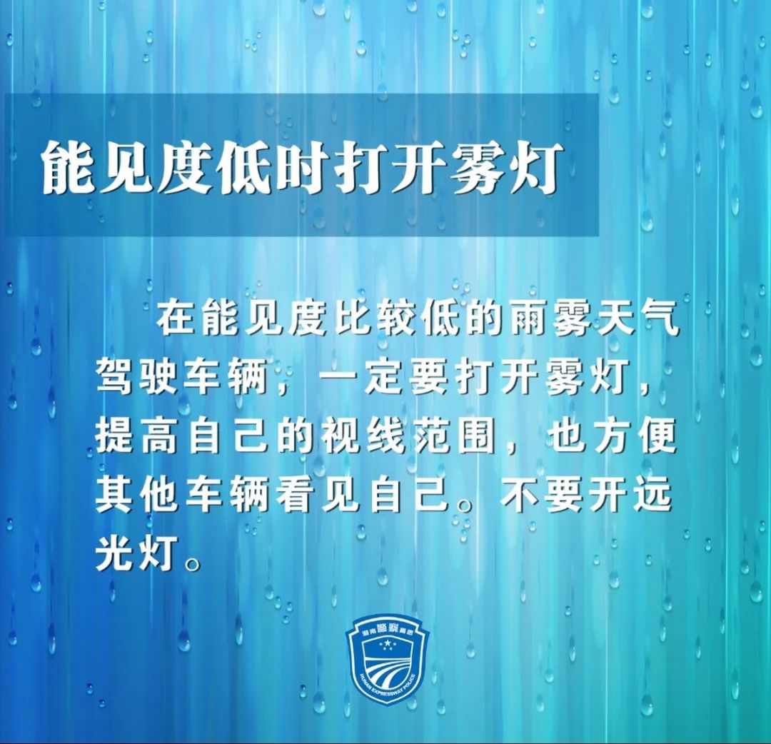 亮尾:根据降雨情况和路面状况,适时开启车辆尾灯、示廓灯、近光灯等,在自己看清路况的同时,也让别人能看到你的车。