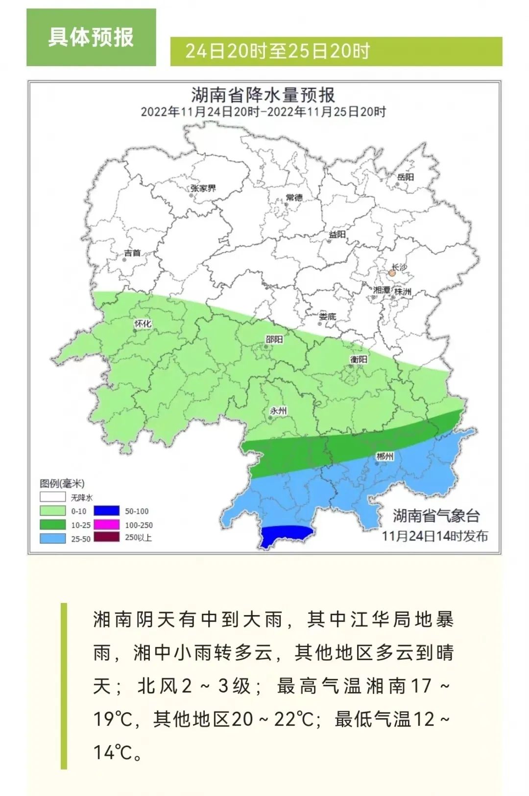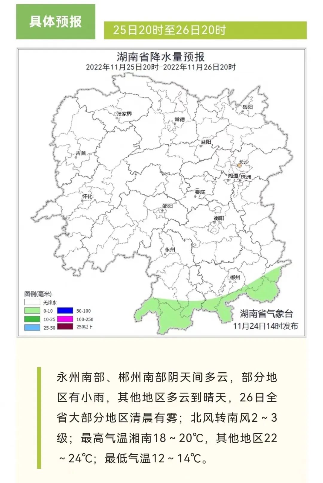 今(24日)晚至明天白天,湘南局地有大到暴雨;明晚至26日白天,迎短暂降雨间歇,以多云到晴天为主,大部地区早晨有雾;26日晚至28日,省内自北向南开启新一轮降水过程,湘南局地暴雨。需要持续关注的是,月底将有一股寒潮来袭,并带来雨(雪)、大风、降温天气。