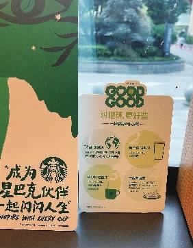 星巴克咖啡店在门店一角设立了提醒牌,告诉消费者自带杯可立减4元。