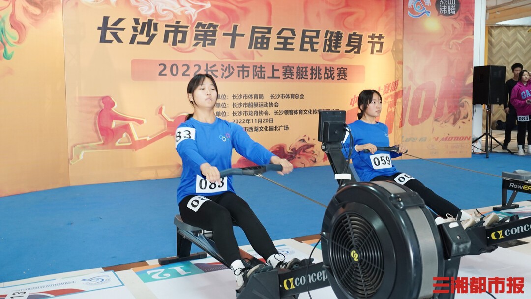 华声在线11月21日讯(全媒体记者 叶竹)在陆地上比赛划船?对,你没看错。20日上午,长沙市第十届全民健身节暨2022长沙市陆上赛艇挑战赛在西湖公园举行,现场160位选手拉动手柄,或全力加快前进,或保持匀速战术。