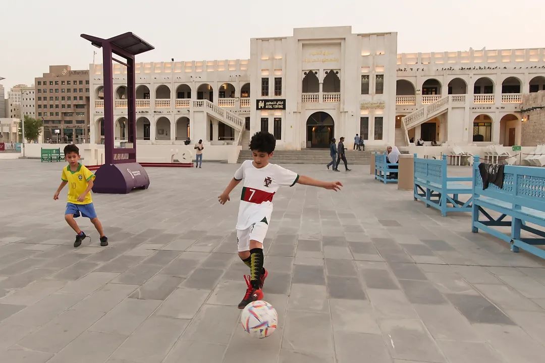 (11月8日,小朋友们在多哈瓦基夫市场的空地上踢球。2022年卡塔尔世界杯开赛脚步愈来愈近,卡塔尔首都多哈街头氛围渐浓。新华社发。)