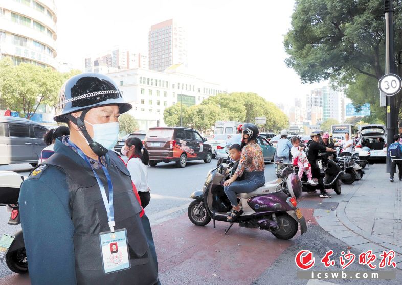 “同学们回家路上注意安全!”“谢谢叔叔,再见!”14日17时30分许,市公安局交警支队开福大队五中队民警谢卿在校门口嘱咐小朋友注意安全。不远处,家长志愿者组成的“护学岗”已在各点位等候,学校老师、保安和社区工作人员等,及时对走出校门的学生进行引导。