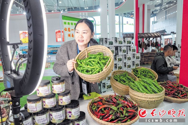 今年农博会上,肖胜蓝带来了两公斤装的辣椒“大礼包”,有微辣、中辣等不同口味。粉丝直播间下单,基地将当天采摘、当天发货,长沙地区当天送达,这也意味着,消费者可以吃到沾着露珠的新鲜辣椒。