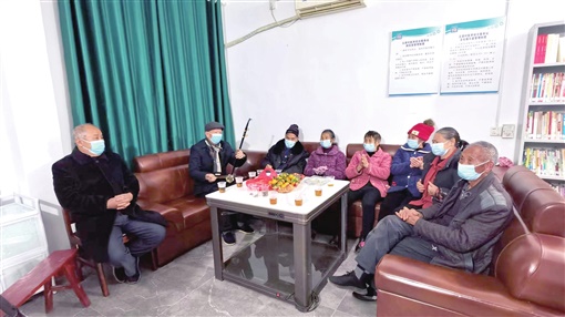 桂阳县仁义镇五美村医养结合服务站,老人齐聚一堂,76岁的朱俊义用二胡演奏《刘海砍樵》。