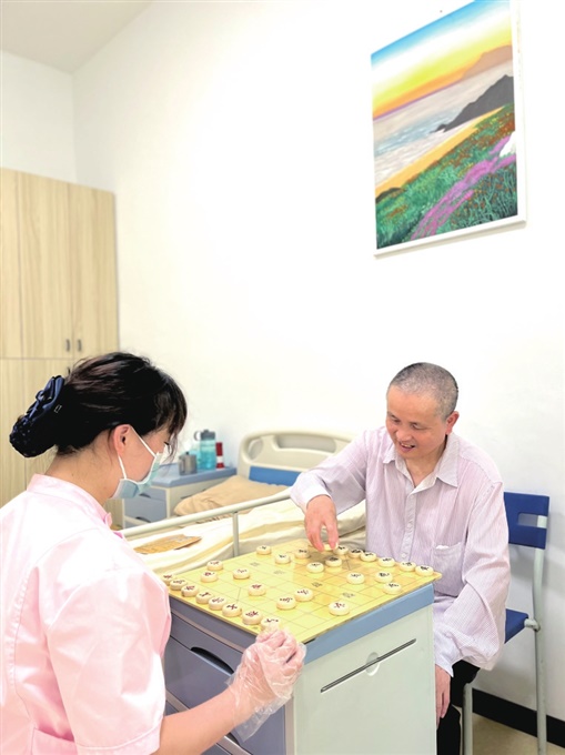 桂阳县厚思养老服务中心工作人员陪康复老人下象棋。