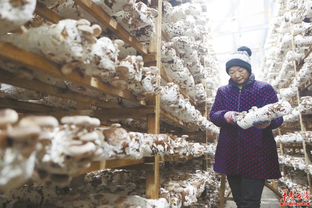 12月27日,衡东县三樟镇义门村,村民在采摘香菇。近年,义门村利用山林资源优势,成立香菇种植合作社,兴建了1万平方米的香菇种植、加工厂房,年产鲜菇30万公斤,带动村民增收致富。