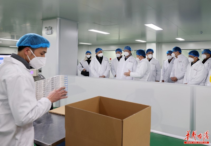 (毛伟明在尔康制药股份有限公司车间了解重点防疫药品生产情况。以上图片均由华声在线全媒体记者 赵持 摄)