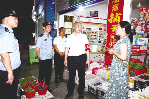 8月3日晚,涟源市“万人大巡逻”活动中,涟源市委主要领导同志率队开展夜巡,向沿街商户了解社会治安等情况。(涟源市委政法委供图)
