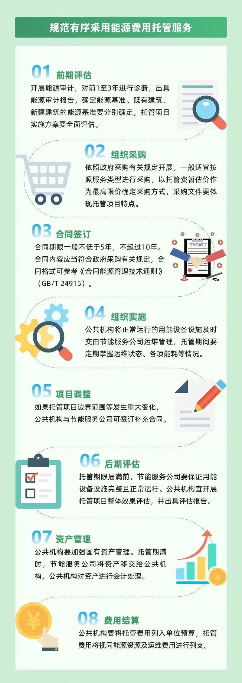 省机关事务管理局表示,要优先在重点用能单位、集中办公区、新建建筑和既有建筑改造中,推进能源费用托管服务。“托管”能源分为八步: