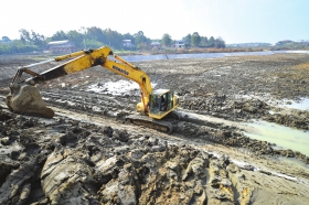工人在湘乡市泉塘镇双江村使用机械修建用于农田灌溉的蓄水塘。图/新华社