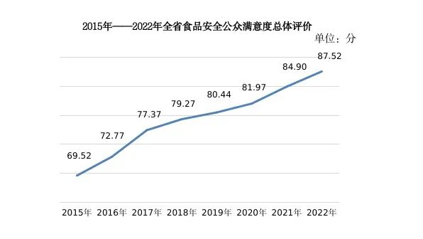2022年,这次调查,公众对食品安全总体评价得分为87.52分,比2021年提高2.62分。社会在进步,食品安全也越做越好,湖南人的满意度已连续8年提高。