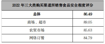 从评分来看,大家认为平日里的蔬菜水果、米面油的安全程度,还是比较高的,为这两类食品获得了88.87分、88.76分;肉和肉制品的安全程度是5大类食品中评价最低的,为86.67分。