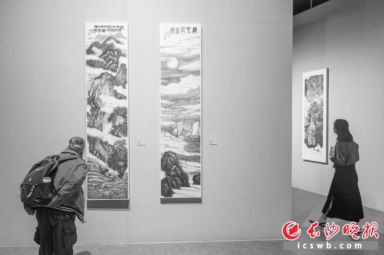 ▲第八届“艺术长沙”双年展之彭先诚“诚者亦灵变”个展现场,书画爱好者在仔细品味国画笔墨韵味。长沙晚报全媒体记者 董阳 摄