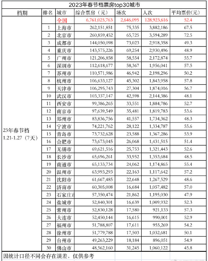 其中,长沙市进入全国春节档票房前30城市,排第18位,超过135万人次观影,平均票价48.5元,高于总票房更靠前的武汉市、郑州市。