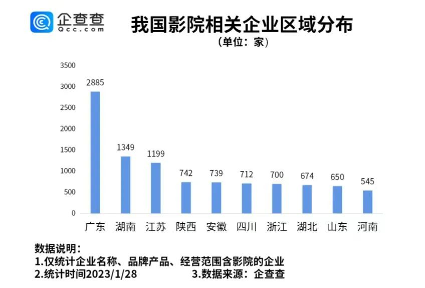 从区域分布来看,广东省以2885家影院相关企业排名第1;湖南紧随其后,存有影院相关企业1349家,比今年春节档票房“冠军”江苏省还多150家。