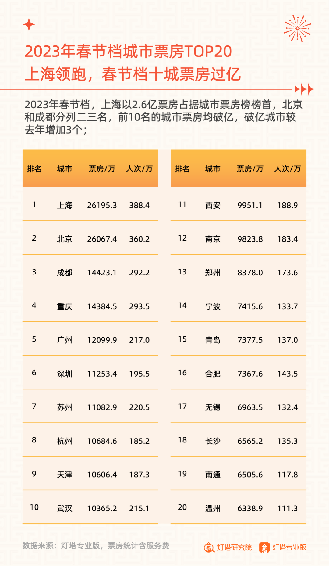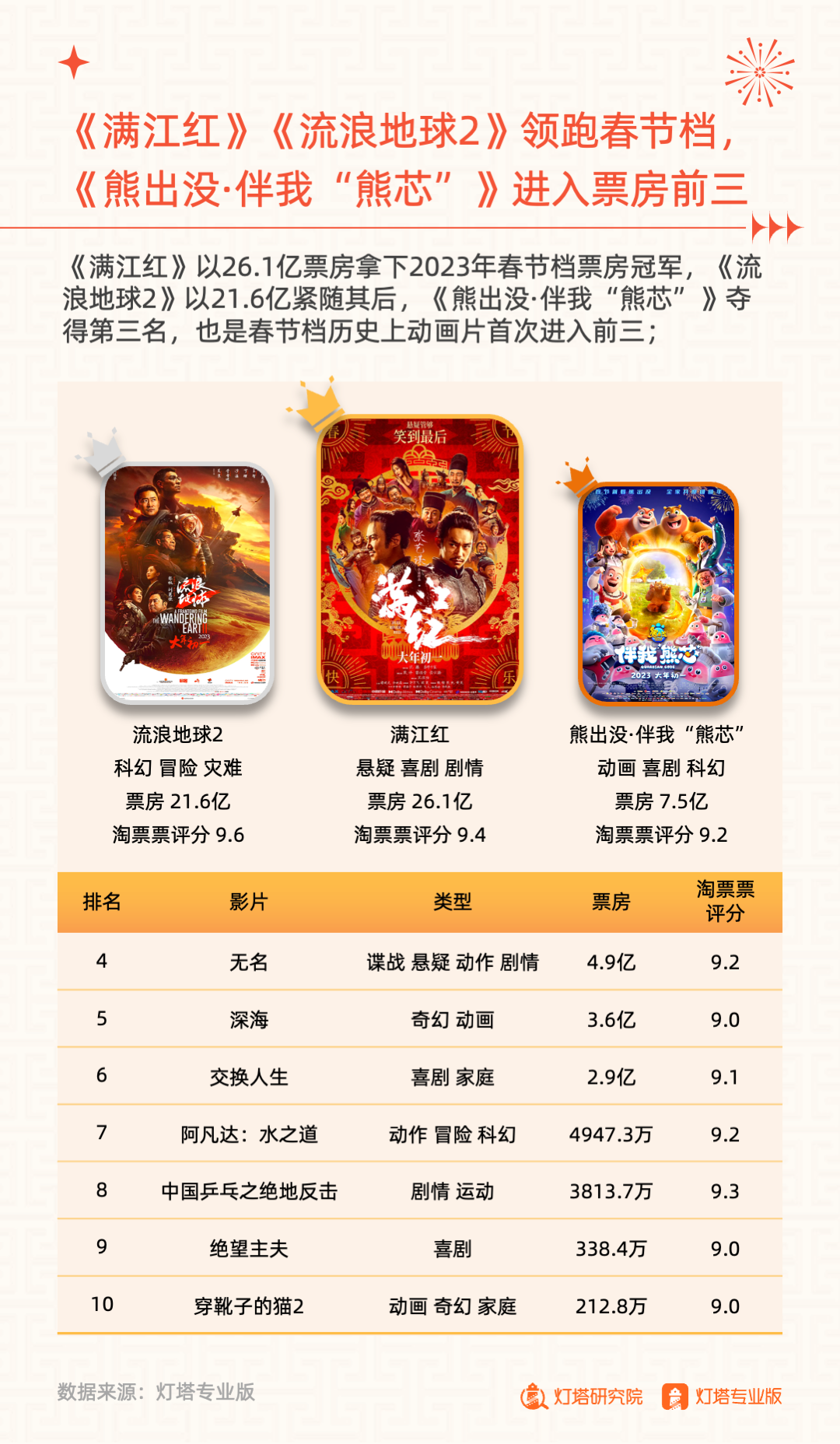 据国家电影局初步统计,2023年春节档电影票房为67.58亿元,观影人次为1.29亿。《满江红》《流浪地球2》《熊出没·伴我“熊芯”》分别以26.1亿、21.6亿、7.5亿列档期内票房前三名。从档期票房看,今年春节档超越了去年的60.39亿元,成为中国影史春节档票房第二位,距离2021年78.42亿元的“史上最强春节档”亦不遥远。从疫情中走出的中国电影市场,有望在今年重攀高峰。