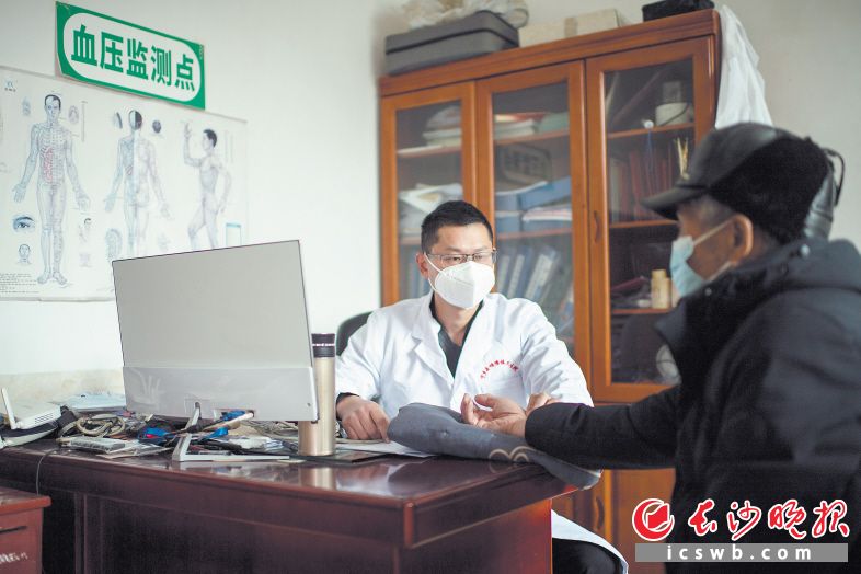 “您最近吃得怎么样?胸口还闷吗?”张杰兵为84岁的五保户、孤寡老人胡娭毑测了血压、心率等,告诉她如何用药,并聊了生活日常。谈话间,两人熟络得像亲人。胡娭毑有数十年的冠心病史,并有慢阻肺疾病。46岁的张杰兵当了25年村医,就为她看了25年病。如今,每隔一段时间,他便上门来为老人面诊一次。