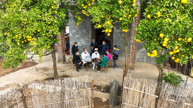 1月5日,在常宁市庙前镇庙前村,医护人员上门为村民进行健康检查(无人机照片)。新华社发(周秀鱼春 摄)