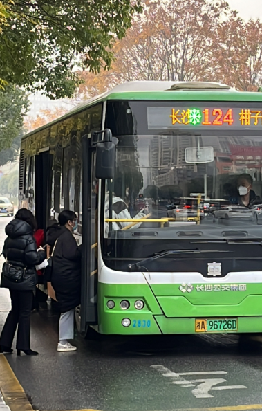 韶山南路桔园立交桥北(南往北)公交站,许多市民已经在此等候。站台上陆陆续续有市民前来。据记者观察,路面上的汽车流量较2022年下旬工作日有明显增多,驶进站台的公交车上乘客也相对较多。记者随机乘坐了一辆公交车,发现车上没有剩余座位,但并不拥挤,乘客们都自觉戴上了口罩。