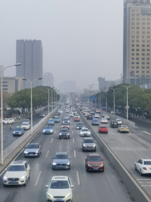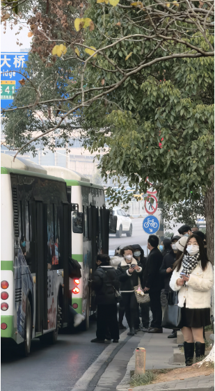 小郑经过桔园立交桥俯瞰南二环,车流量已经明显增大,甚至还有些拥堵。路上,人们纷纷动身前往公交站和公司。路边的共享单车也一辆一辆被骑走。公交站台上挤满了早高峰的人。小郑感叹:“新年第一个工作日,熟悉的主干道又回来了。”
