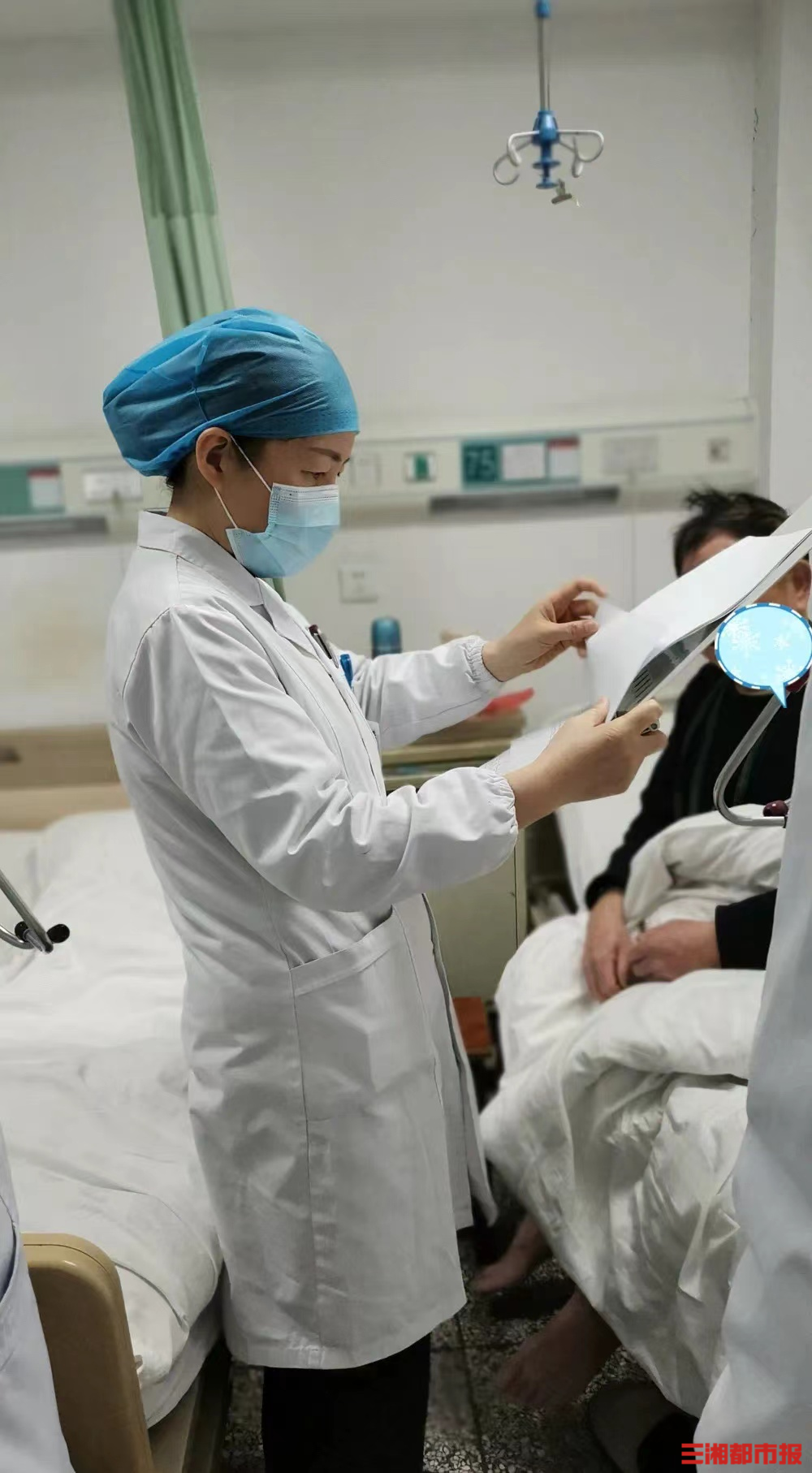 (李洁芳在病房内询问病人恢复情况。)