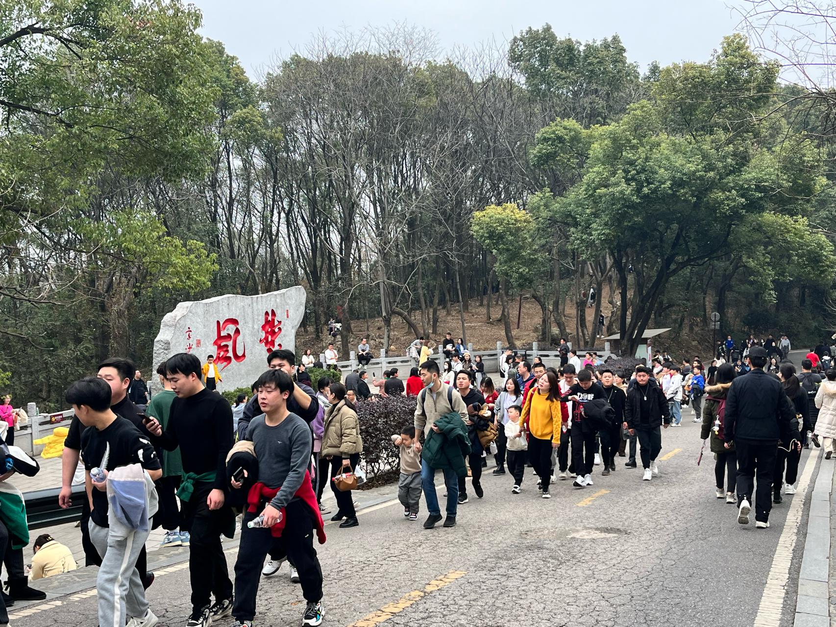 爬山“大军”洋洋洒洒,几乎占了半边马路,观光车一路上都用喇叭喊着:“注意车辆,请避让。”