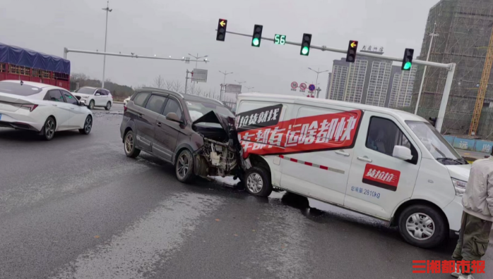 岳阳县交警大队民警赶到事故现场发现,两车追尾相撞停在路口中间,后方棕色面包车车头受损严重,完全卡在前方白色小货车车尾部。