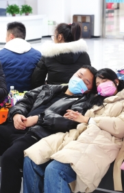 2月14日,长沙市雨花区民政局婚姻登记中心,等号的时候,谭先生和万女士依偎着在大厅沙发上补觉。组图/记者 杨旭