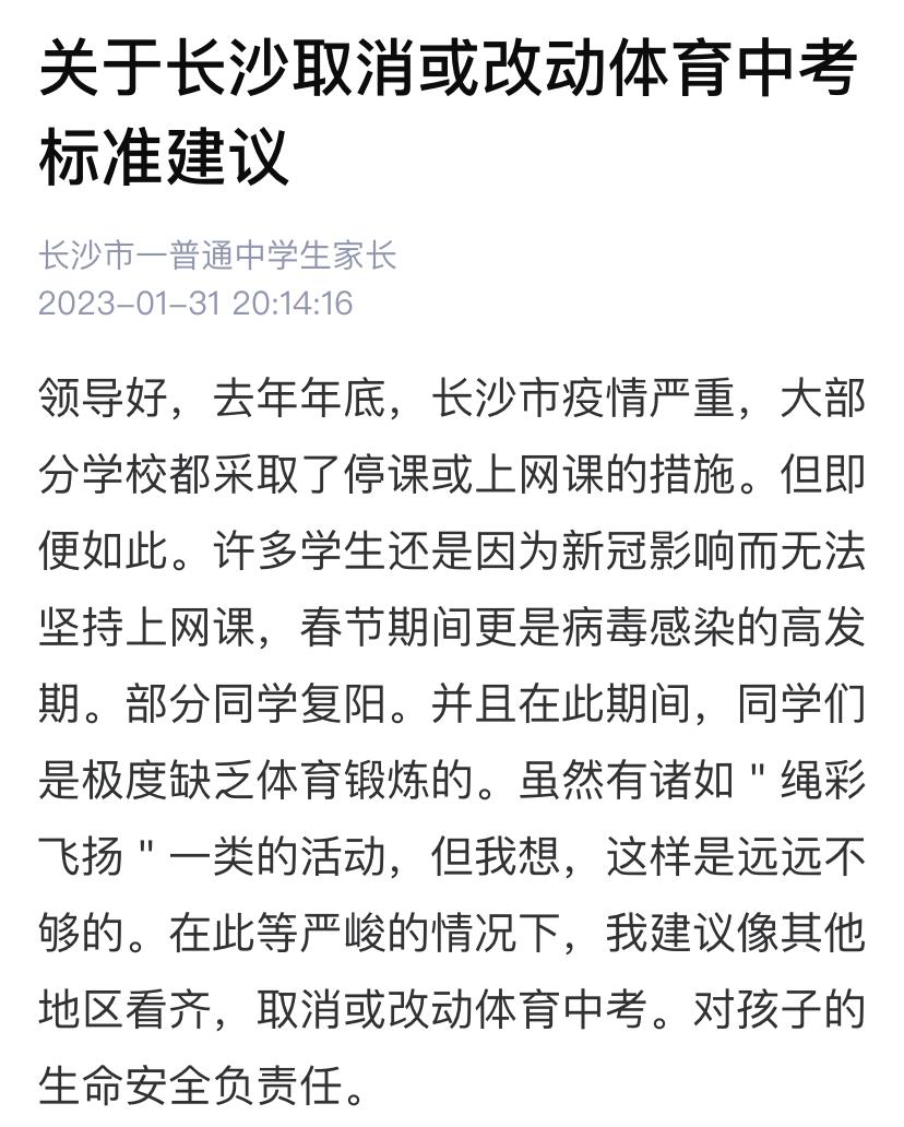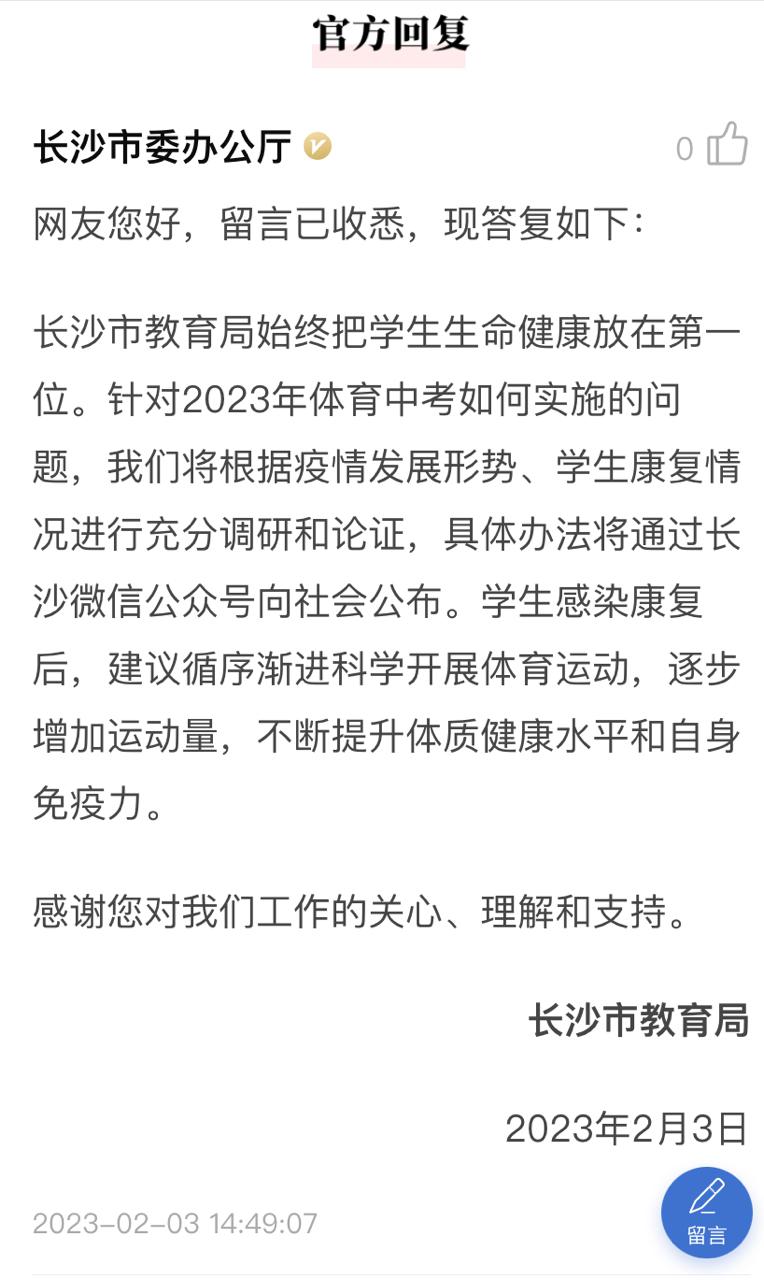 在湖南,有署名为“长沙市一普通中学生家长”的网友在某问政平台,也提出取消或改动体育中考的建议。对此,长沙市教育局日前进行回复说:“长沙市教育局始终把学生生命健康放在第一位。针对2023年体育中考如何实施的问题,我们将根据疫情发展形势、学生康复情况进行充分调研和论证,具体办法将通过长沙教育微信公众号向社会公布。学生感染康复后,建议循序渐进科学开展体育运动,逐步增加运动量,不断提升体质健康水平和自身免疫力。”