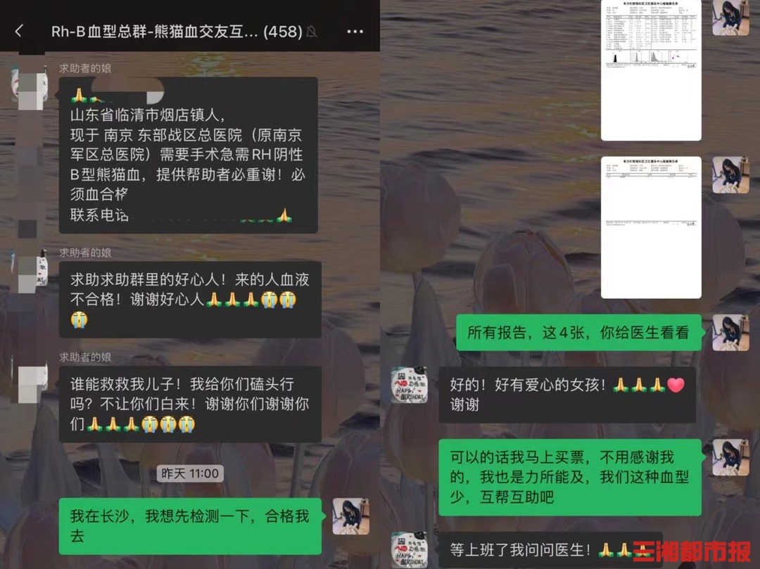 华声在线2月10日讯(全媒体记者 胡锐 通讯员 胡谦)“求助群里的好心人,谁能救救我的儿子!”“我在长沙,我先去检测一下,合格我就去!”两天前,因为这一句承诺,家住长沙市岳麓区麓源社区的“95”后热心女孩张好(化名),连夜奔赴800多公里外的南京,捐献了400毫升“熊猫血”,并和其他6名Rh阴性B型血的爱心人士一起,共同挽救了一名重症山东小伙的生命。
