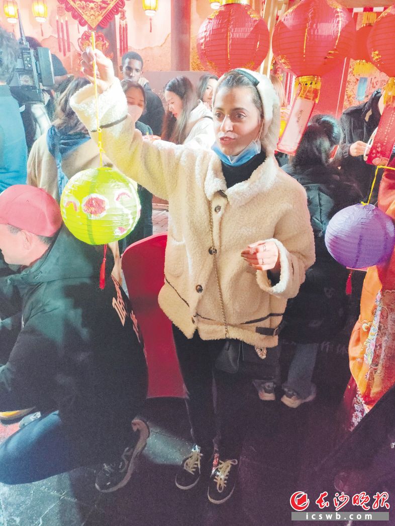 外国友人展示花灯。长沙晚报全媒体记者 宁莎鸥 摄