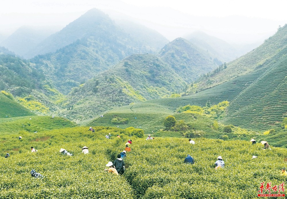 3月26日,江华瑶族自治县桥市乡,采茶工在茶园采摘明前茶。清明临近,当地茶园进入明前茶采摘期,人们抓紧时间采摘、加工新茶,抢“鲜”供应市场。 蒋克青 摄
