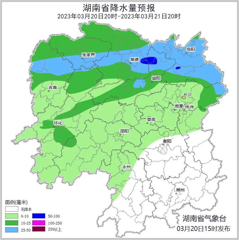 20日20时至21日20时,湘北阴天有中等阵雨或雷阵雨,其中湘西州北部、张家界南部、常德中部、益阳北部、岳阳、长沙东部部分地区大到暴雨,衡阳南部、株洲中南部、郴州、永州中南部多云到阴天,其他地区阴天有阵雨或雷阵雨;北风2~3级,雷雨时局地阵风7级;最高气温湘南25~27℃,湘西、湘北13~15℃,其他地区15~17℃;最低气温湘南15~17℃,其他地区9~11℃。