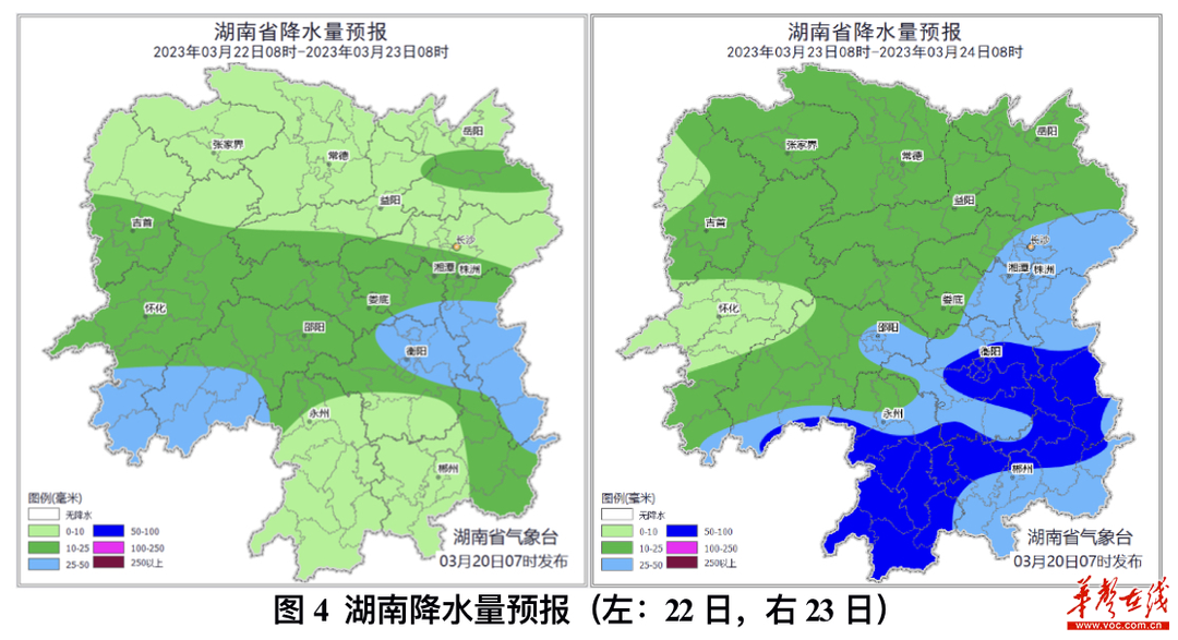 3月23日,阴天有中等阵雨或雷阵雨,其中长沙东部、湘潭东部、株洲、衡阳、邵阳东南部、永州、郴州部分地区大雨,攸县、茶陵、炎陵、衡阳市区、衡东、衡南、耒阳、常宁、郴州市区、永兴、资兴、桂阳、嘉禾、永州市区、双牌、宁远、新田、道县、江华、江永、蓝山、东安、城步、新宁暴雨(图4右);北风3~4级,局地阵风6~7级;最高气温湘南18~20℃,其他地区15~17℃;最低气温湘南9~11℃,其他地区7~9℃。