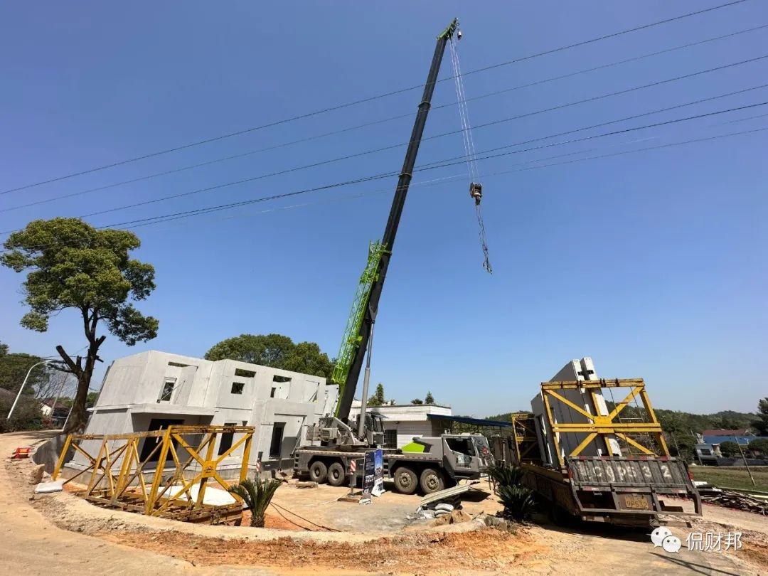 3月12日8时18分,朱先生家的乡村别墅正式开工建设。货车将每天要用的板材运进村,现场吊装车将板材一块块吊上去,工人只需要拧紧预留洞孔里面的螺丝,连接楼板与墙面。侃财君注意到,一块板材从吊装到安装完成仅需几分钟,每一块板材都贴有二维码,有自己固定的位置。3月15日,房屋主体结构完工,前后仅用4天。