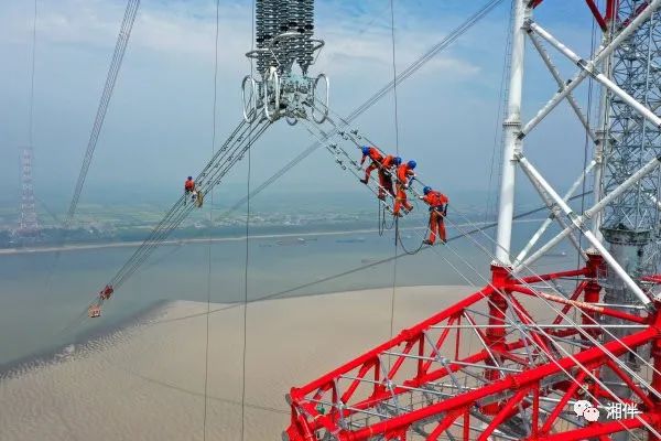 (1000千伏南阳—荆门—长沙特高压交流工程螺山长江大跨越工程现场,国网山东送变电公司的工作人员在高空紧张施工。湖南日报全媒体记者 郭立亮 摄)建议提出,请求加大“宁电入湘”工程支持力度,支持湘粤联网工程纳规并加快建设,为高质量发展提供更好能源支撑。