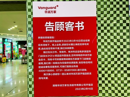 2月28日,三湘都市报记者在华润万家V+城市超市进口处看到,其显眼位置张贴了“告顾客书”。上面写着:“华润万家开福店将于2023年3月16日营业结束后关闭线下、线上业务,感谢您长期以来的支持与关爱,由此给您带来不便,我们深表歉意。”