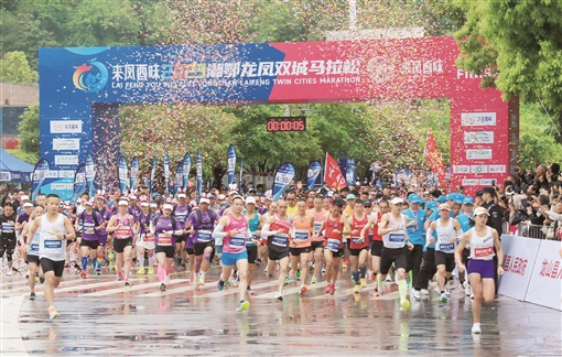 4月29日7时30分,2023湘鄂龙凤双城马拉松赛在湖北省恩施土家族苗族自治州来凤县、湖南省湘西土家族苗族自治州龙山县举行,来自五湖四海的约2万名马拉松运动员和跑步爱好者用脚步丈量“活力龙凤”“团结龙凤”“特色龙凤”城市魅力,触摸两城的历史脉搏。