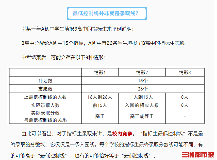 值得一提的是,对于指标生录取来讲,是校内竞争。“指标生最低控制线”不是最终录取的分数线,它仅仅是一条入围线。每个学校的指标生最终录取分数线可能不同,有的可能高于“最低控制线”,也有的可能恰好等于“最低控制线”。