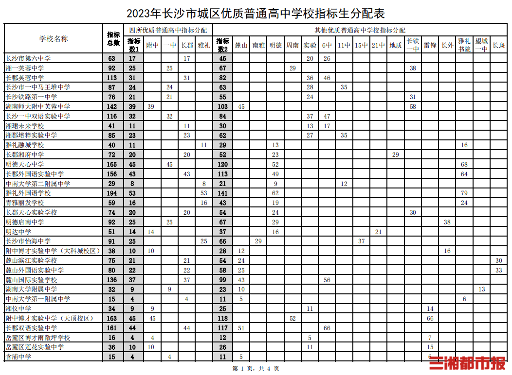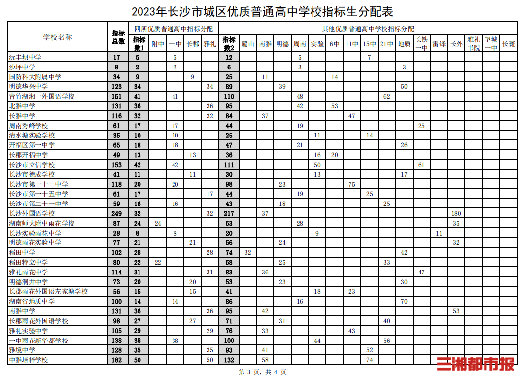 华声在线4月28日讯(全媒体记者 黄京 杨斯涵)根据《关于做好2023年长沙市城区高中学校招生工作的通知》(长教通〔2023〕17号)精神,今天,长沙市教育局中招办下达了2023年长沙市城区优质普通高中指标生计划。据悉,今年每所初中学校原则上分配3所优质高中学校指标生计划。