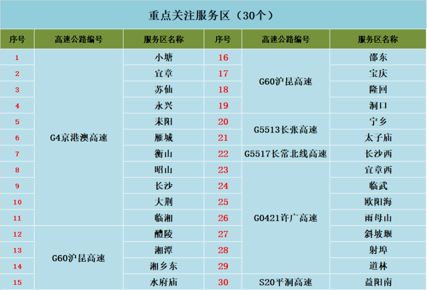 根据研判,“五一”假期湖南高速公路服务区客流负荷增加,客流较大的服务区有:G4京港澳沿线各服务区,G60沪昆高速沿线服务区,G0421许广高速沿线服务区,G5513长张高速宁乡、太子庙服务区,G5517长常北线高速长沙西服务区,S20平洞高速益阳南服务区。