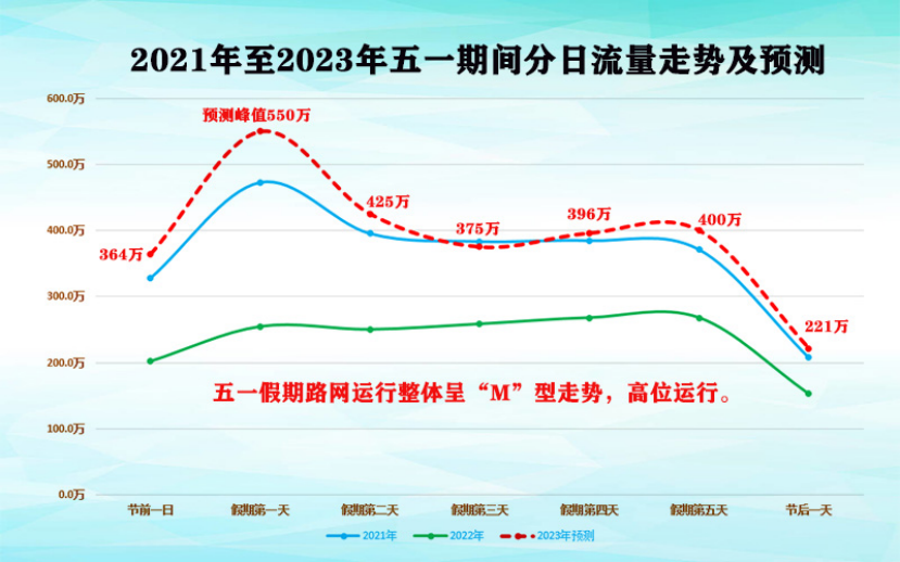 研判预测,2023年“五一”假期(5天),湖南省高速公路出入口总流量为2146万辆次,日均429万辆次,较2022年同比增长65.28%,较2021年同比增长7%。预判峰值日出现在4月29日(假期第一天),峰值流量约为550万辆次,是平日的2.6倍。