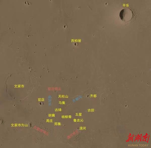 华声在线4月24日讯(全媒体记者 黄利飞)今天,在2023年“中国航天日”主场活动启动仪式上,国家航天局和中国科学院联合发布了中国首次火星探测火星全球影像图。影像图中标明了以中国历史文化名村名镇命名的地理实体,周庄、西柏坡、天柱山、漠河、齐都等22个名字“登上”火星,其中一个环形坑、穹丘和方山,分别以“文家市”“文家市穹丘”“文家市方山”命名。