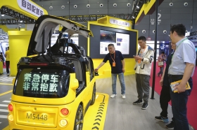 4月19日,长沙国际会展中心,一辆黄色涂装的自动配送车看起来很萌。图/记者吴琳红